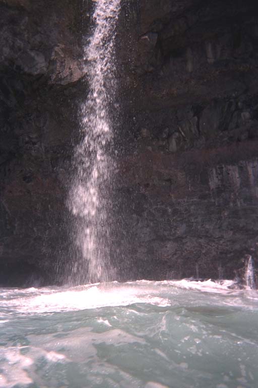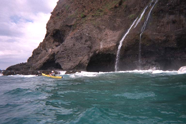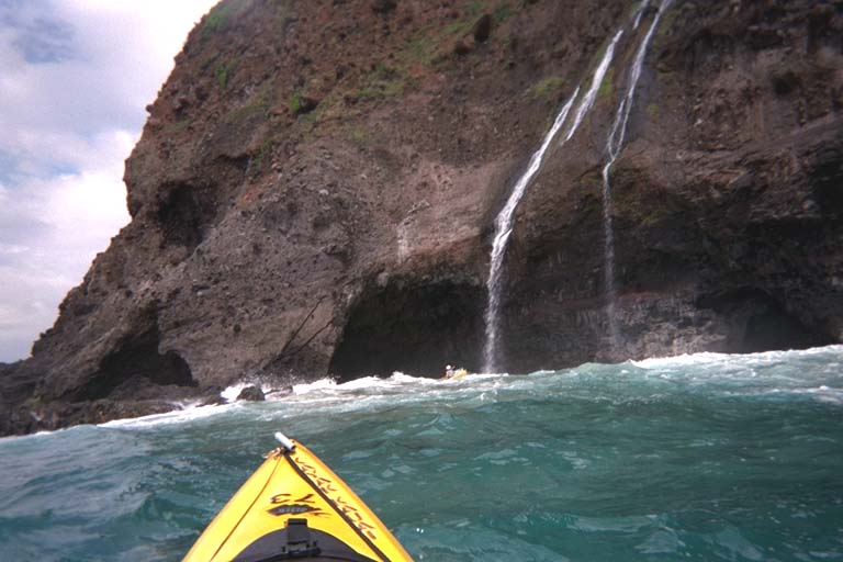 One cave had a long jagged sloped roof that started high on the right side but continued on under water on the left.. On the high side it looked like you could paddle way back to an almost calm rocky beach with the cave turning and continuing to the right. Neither of us was comfortable enough in there to try this out. While I was sitting in there a large wave came in. It surfed me deeper into the cave but let go of me and let me turn towards the opening. Then the wave reflected 90 degrees off the steep wall on the high side and threatened to surf me directly under the sloping roof . I was broadside to this wave but managed to slip over the top of the breaking water by rocking the edge of the kayak up over the wave and back down on the far side. Then I paddled out to safety.