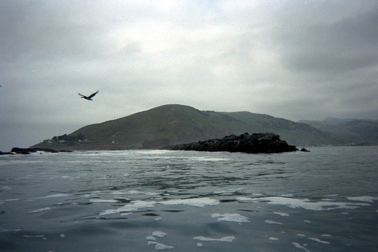 Several other kayakers sounded interested, but nobody else showed up at 9:00 AM on Sunday except Don and I. We chose a put-in spot well inside the harbor that had a boat ramp and a wide sandy beach. As we were getting into our wetsuits and arranging our equipment two guys came by with a zodiac. We were interested in seeing how these guys did in the rougher than we expected surf. They pulled the boat out into waist deep water, then started the engine. I distinctly saw blue smoke come out when it started that first time, but apparently it died on them. For the next half hour we watched them pull and pull on the starter of that engine, but I never saw another puff of blue smoke. We launched with no problems over the surf and Don joked that when we got back they would still be there in the surf pulling on that engine. This did not turn out to be true, but when we came back two hours later their truck was also gone so they must have given up.