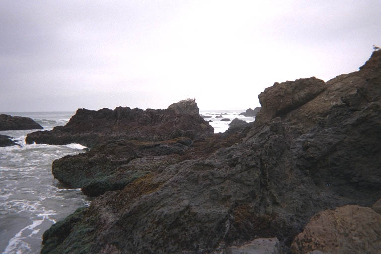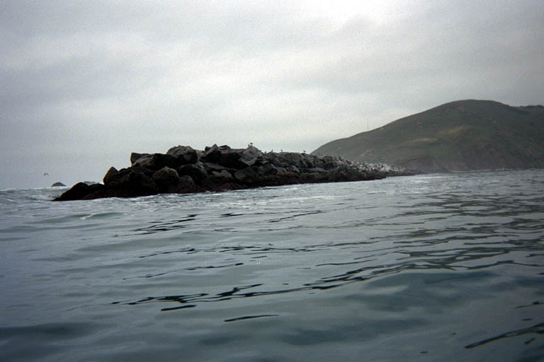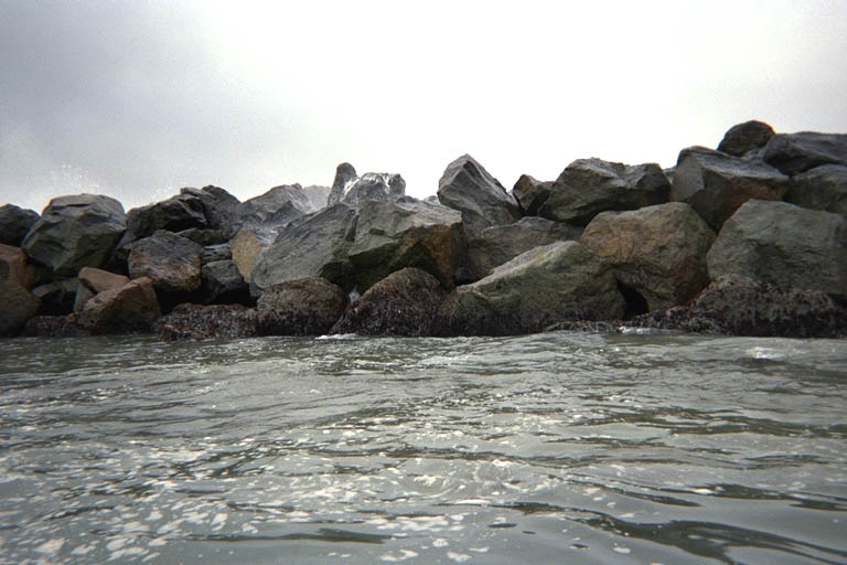 We paddled along the shore and past the beach at the base of the breakwater. We had planned a picnic lunch at the beach but since it was so early we went on to explore the breakwater first. The swells were not as high as the evening before and they only occasionally managed to splash water over the rocks of the breakwater. I sat in a place where the rocks were damp and tried to entice the waves to get me wet. I asked Don if he was ready for his morning shower, but he stayed well back with a camera ready to catch me in the thick of it. The waves calmed down. I tried everything to get them to rise up: I drifted closer and closer to the breakwater. I turned by back on the action. I opened the hatch to my kayak for a second. I took out a non-waterproof camera that had some film in it I wanted to use up. The waves broke over a different spot and we moved there. Nothing worked. I had a long drive home in the afternoon and couldn't sit around here all day waiting for trouble, so we gave up. We did paddle out around the end of the breakwater to see what it looked like on the seaward side. There was a natural row of rocks here and the breakwater was built around and behind these. This was apparently a natural harbor and the man-made breakwater is just an improvement on that. Situating it on a natural reef like this also means the man-made structure will last longer and need less maintenance.