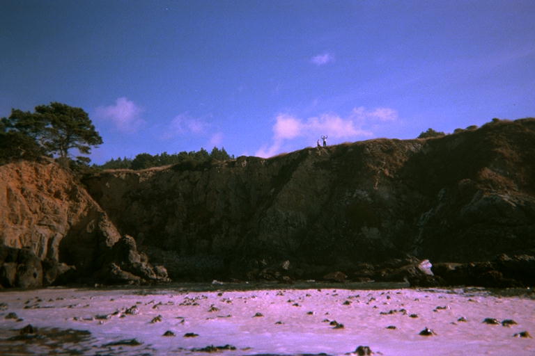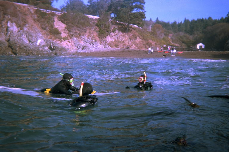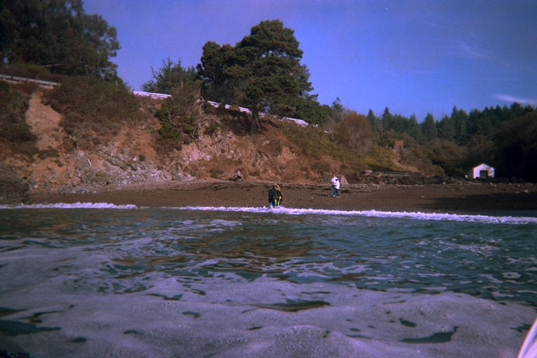 At Stillwater Cove, the water behaved like the name suggests. Unfortunately, this cove is so calm and accessible all summer long, that we assumed (correctly) that any abalone were long gone. This was not going to be a successful abalone dive. After we all got into wetsuits (accept for Ralph and Jeremy) I ran ahead to put my kayak in the water first. My plan was to take embarrassing pictures of Erin flailing about in the surf, then threaten to publish them all later in my WEB page. But when I suggested it, Erin thought the idea was cool. I ended up sitting there a long time, as Erin got a long verbal lesson while standing on the shore and in the surf. Just as they were walking out into the water, a HUMONGUS wave came through the cove. When It broke behind Paul, it was 2 meters tall. Ralph laughed and congratulated them on picking the worst possible time to try to get in the water. Finally, they made it out into the cove, where Erin got more talk than diving as far as I could tell. I paddled around the cove and out to sea a few times, and on one of my returns, I heard that Erin had somehow slipped out of her weight belt. Paul and Derek were diving and searching for it, so I went back to shore to get the rest of my equipment to join them in the search. I said it was like tossing a penny in the swimming pool: Now we had something to dive after in the ocean!