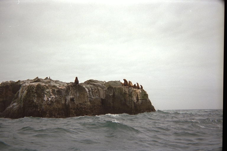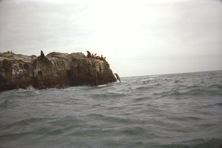 The third rock was the farthest out to sea, and it was actually three rocks with gaps between them. One of these gaps was channeling the waves, and even the medium sized waves would rise up into 3 meter breakers going between the rocks. Now that would be quite a ride! From a distance, I saw only a few sea lions way up on top of the rocks, 6 meters off the water. As I came around the northern corner, there was a strong current pulling me back, and I had to dig in and work hard to keep going. Just as I made it around the corner, me and a large group of sea lions on the rock surprised each other. The first notice I got was when 500 pounds of sea lion dove off the rock and hit the water less than 10 meters from me. I looked up to a chorus of barking and saw another dozen large males 5 meters up on the west side of the rock. A few more of them jumped, and as much as I hate disturbing them, I stopped to take their picture. The wind and current drifted me back towards the rock and that really upset them. I caught a picture of one in mid air as the rest of them went over the edge. I felt guilty about scaring them off their perch, and I began to feel a little insecure on top of the water: I knew that there was about 3 tones of upset animal somewhere under me, attached to 12 sets of teeth that compare, on the scary scale, to the chompers of a bear. Fortunately, sea lions would rather swim away from a threat than charge it like a bear would. After coming up to stare at me from a safe distance, they disappeared. I made my pass at the first rock on the way back, without disturbing those sea lions enough to make them jump off. They saw me coming from a distance, and I drifted past without paddling and splashing and doing other alarming things.