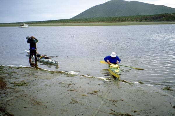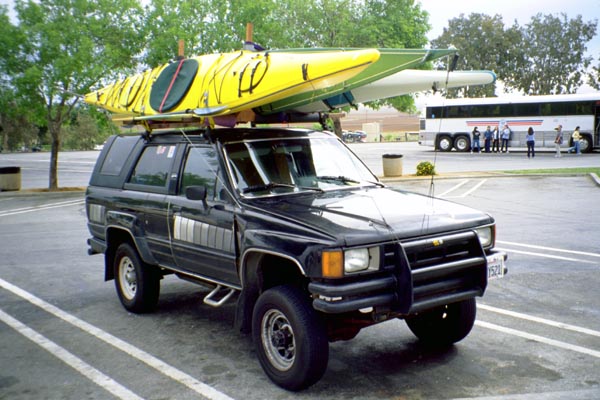 Most people who paddle kayaks in Baja go to the Sea of Cortez. Here there is protection from the swell of the Pacific Ocean, although there are other dangers from the weather. Konstantin Gortinsky would like to paddle all of the Pacific coast of Baja instead. He had two weeks of vacation during spring break and we planned to do a section of this coast together. At one time there were seven people interested in doing this trip, but when it came down to making definite plans, only three of us remained. Konstantin, Sid Taylor, and myself. Konstantin and I drove down to Berkeley together and met Sid who drove down from Trinity County. We packed all our gear in my Toyota 4Runner, three kayaks on top, and three of us in the remaining space. We drove down to San Diego in one day, then drove into Baja on the second day and made it to our put-in spot by 2:00 PM on Saturday April 7th. We decided to pack up and launch the kayaks immediately for a short evening paddle and our first night camping.
