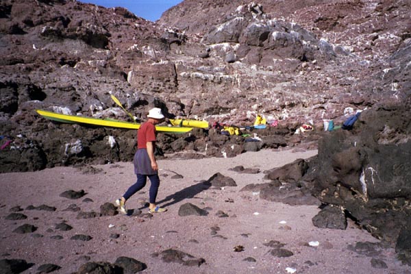 After circumnavigating Isla Pomo, we turned back to Isla San Louis to finish rounding that island. At the north end of this we turned out to sea and headed to the next island. Isla Entrada is made of layers of white and red basalt dropping steeply into the water. Curiously this island did not seem to be covered in bird droppings like all the others. We looked forward to staying somewhere we would not get screamed at by birds everywhere we went. Sid and I landed for a few minutes on the south face of the island, which was too steep for birds to nest on. Also too steep to camp on. As we rounded the corner of the island we discovered that it sloped gently into the sea on the north end and was knee deep in nesting birds, not to mention guano. We had been told by our local friend that there was a landing beach on the west side of the island. We explored the entire west side and found no-place to land. Finally on the north tip of the island we found a small beach. If the weather turned bad, the wind and waves from the north would make this a bad place to be. In addition we were pretty sure that this beach was under water on high tides. We circumnavigated the whole island looking for a better place to camp and found none. So we went back to the small sandy beach.
