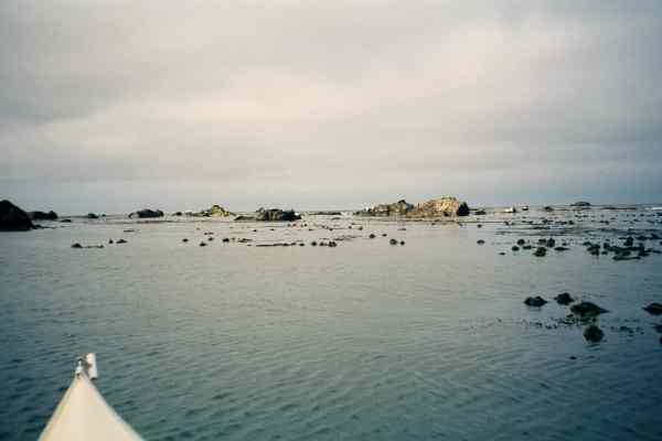 In the morning we were still alive, or we had been crushed by the trees and were in Heaven. We packed up and for once I was ready as fast as Konstantin. We launched and turned to travel close to shore. Partly to try and avoid scaring seals on the offshore rocks and partly to do some fun rock gardening. We were encouraged to move away from shore by some breakers in shallow water and then buy huge waves rising up at Andrew Molera Point. We guessed that it might be from a southern swell but did not go in close to ask some surfers about conditions. South of Andrew Molera we saw a large field of kelp so we stayed outside for a few miles. At Cooper Point we went inside again and went rock gardening through all the rocks offshore of Pfeiffer Beach. At the next point we saw large kelp fields again and went outside. We stayed there for miles, heading straight for the next major point. Partington Point is one of the places we had considered looking for a camping spot where two narrow cracks in the cliff might create protected beaches. The first notch in the cliff had deep water and ended on a beach of large rocks. A park trail led down to it and we saw people there. The second notch in the cliff had shallow water and ended in a cliff so steep that it overhangs the water. Under the overhang was a beach made of rough granite cobble. I could not resist risking scratching my boat to go in for a landing.