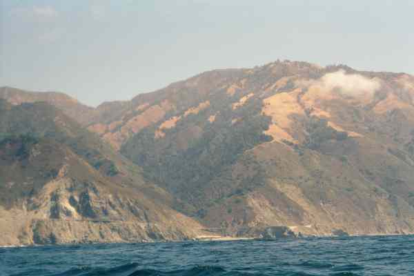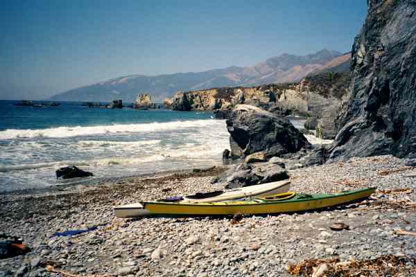 Around Gorda Point there was a large cove with a road leading down to it and I didn’t want to get that close to civilization. We looked at the last small cove before the large one and found reasonable surf crashing on a beach with a high flat berm to camp on. I went in first and had a wild surfing/broaching ride but managed to stay upright. Konstantin chose a better window and made a perfect landing.