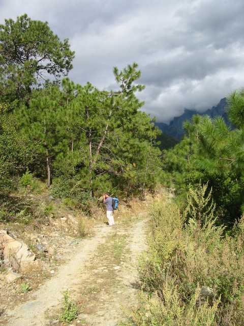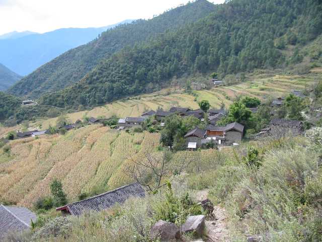 So we were looking lost on the road when a local man came by an offered "I help you". He directed us up a steep trail that did not match any of the descriptions we had read. He was well dressed, had good shoes and didn't look like a highway robber. We showed him our maps and thought we communicated to him where we wanted to go. One problem we had may have been that one of the places on the correct trail was the "Naxi Village Guest House". All the villages in the area are inhabited by the ethic minority people called Naxi and our friend kept answering in the affirmative, he was taking us to a Naxi village.