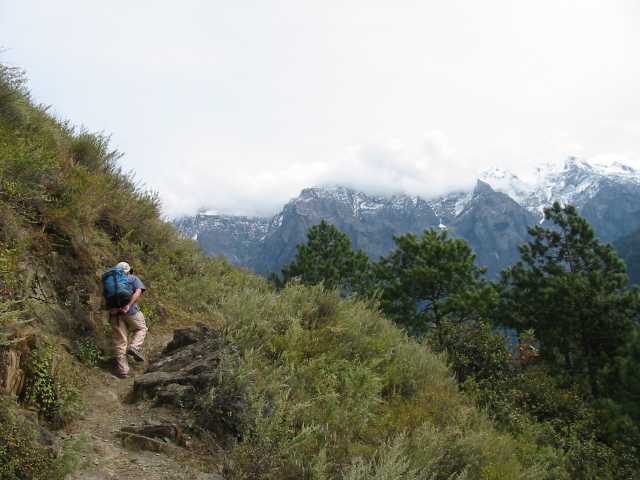 Our guide (we never wanted a guide) dropped his pack and continued to offer "I help you", finally saying "No money, I help you". On our map he indicated that he knew the way to link us back with the main trail, part way up the steepest part. We let him lead us out of town, a maze of crisscrossing trails. He lead us past some spectacular viewpoints where we could see the Dragon Jade Snow Mountain. This mountain is almost 5600 meters tall and always covered with snow. It is the highest mountain that either Joe or I have ever seen with our own eyes.