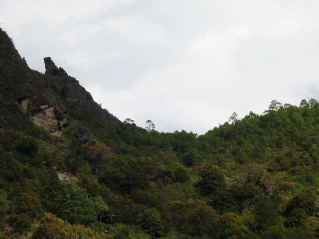 It cost ¥30 to get into the gorge area, up from the amounts we had heard in the guides, but that’s life. The trail start was supposed to be at or after a school and the maps (not to scale) showed the trail going past the right side of the school. Our guidebooks said ambiguous things like "On the other side of the school you will start seeing yellow arrows directing you the rest of the way." It was only much later, by reading a "Lonely Planet" guidebook that we found out we were supposed to go in the main gate of the school, walk past the basket ball court and the football field and "then you will start seeing [red and blue] arrows directing you the rest of the way".
