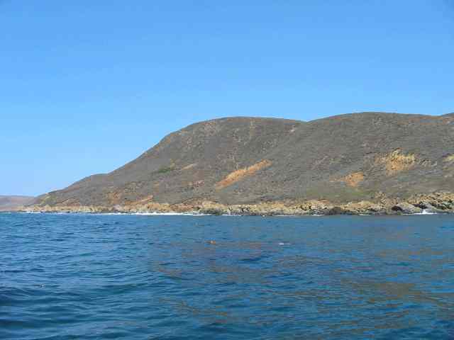 I did a pretty good job of timing the southern swell and paddling out between them, although I did get my face wet plowing through one wave. We managed to launch at 9:30 AM, which is pretty good for driving out to the shore and figuring out how to fit everything in the boat the first time. When Konstantin joined me we turned and started south pretty close to shore, staying far enough out to not get caught by a southern swell but still inside the thickest kelp. The kelp was not as thick as we remembered from the trip that ended here. In the kelp we saw lots of sea otters and sea lions. The sky was overcast in the morning but cleared by noon. A slight breeze pushed us south all day so we averaged four mph! We got to China Harbor, our intended camp an hour and a half early on an easy sixteen mile day. As we rounded Estero Point to look for the harbor we could see Morro Rock in the distance. It looked as if we could easily keep paddling and get there in an hour or two and get ahead by one days paddling. Perhaps the air was just incredibly clear, scrubbed by the gentile breeze that helped push us south all day.