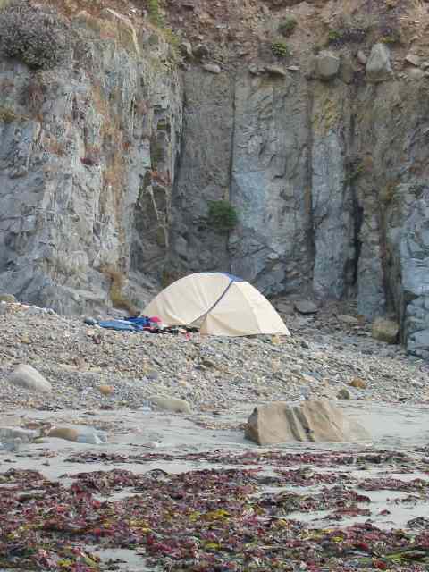 China Harbor is named this because it used to be the place where a group of Chinese immigrants collected and dried seaweed for export. The harbor is a small south facing cove with sandy beaches, protected from the prevailing wind and swell. Perfect for landing kayaks on and almost as nice as I had hoped after looking at the California Coastal Records picture of it. The sand looked high enough to be safe from the tides, but we watched the high tide go by and saw one or two waves wash part way over the hump. Konstantin decided to dig a flat spot in the sloping sand closer to the cliff. I did the same thing, then changed my mind and cleared the larger rocks off the top of a small cobble berm for my tent. Not for fear of the high tide getting me, but just to avoid sleeping near the sand. We spent a lazy afternoon reading and talking and watching the tide.