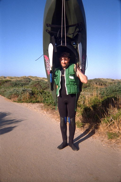 I chose to get a sit-on-top kayak. Purist kayakers will probably say that this isn't REALLY a kayak, but I'm having fun and getting a lot of exercise. The biggest reason why I got this style is because of the kayak roll: A real kayak is most stable upside down with your face underwater. Before you can go paddling in real water, you have to practice this special twist with the paddle to flip the kayak right-side up before you drown. I've seen people practicing it over and over again in Aquatic Park in Berkeley. It looks like being in a washing machine. You have to practice it until it becomes second nature. But in a sit-on-top kayak: if it rolls over, you fall off. Then you get back on. No problem. No face held under water. You have to wear a full wetsuit, but I already had one of those. Since I got it, I've found a few other good reasons for having a sit-on-top: Getting in and out of the ocean. I can just walk out through the breakers towing the kayak, and then get into it. Waves break where the water is shallow, so you can usually get most of the way through them on your feet and not take the chance of getting wiped out on your way out. Coming back to shore has a similar advantage: If the mother-of-all- waves breaks behind you, get out. If waves are breaking behind you, it means the water is shallow enough to stand up in and run. Let the wave smash the kayak onto the beach without me, thank you very much. I've been meaning to go out one day with the express purpose of landing over and over again until I figure out how to surf. Marty says I have a phobia about waves near the beach. In a real kayak, you cannot get into it after getting in the water, so I assume you strap yourself in, sort of turning yourself into a voluntary paraplegic. In this helpless condition, you wait for the mother-of-all-waves to dunk you and put enough water under the keel to start paddling out through the next few face-slamming waves. I got the smallest type of kayak I could find in this style: 9 feet long. It weighs 40 pounds, so it's not a problem to carry it. I hoist it up on my back and carry it down and up the zig-zag trails to some of the beaches.
