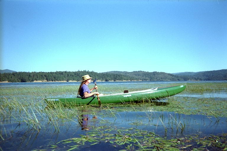 One reason for trying to make the FolBot canoe lighter was because Marty had a lot of trouble holding her end of the canoe up while taking it off or putting it on top of the VW bus. When it became apparent that I was not going to get around to finishing or fixing something else soon, I bought a new manufactured canoe. It was a partially canopied canoe again, made of Kevlar fiber so it could be lighter than a normal fiber-glass canoe. It was 50 pounds when new, but we swear that it has gotten a lot heavier over the years. We call it the Bullet Proof Canoe sometimes. This canoe had one disappointing problem: It will not go in a straight line without constant correction. It was designed for two-person white water canoeing (which we have never had any interest in doing) and apparently was designed to be unstable in this direction so it could be turned in a hurry. The place we bought it suggested adding a keel or a rudder. I tried building a rudder once with limited success, but it eventually came apart. The behavior is this: if you are paddling in a straight line, and you stop actively paddling or steering, the canoe will turn sideways and stop instead of gliding forwards on its momentum. If you notice that this behavior has started and the nose is starting to turn, it's too late: Paddling with all your might on the opposite side will not make it go straight again. You have to predict when the canoe is about to do this behavior and start correcting before it starts. Over correcting causes it to reverse and do it on the other side. In choppy or windy conditions it is worse. With practice, in calm water, you can make it go where you want, so we have had a lot of great trips in it, in Monterey bay a few times, but mostly on the Russian River.