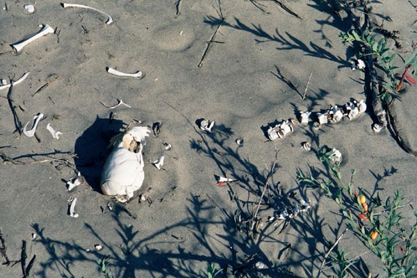 Behind my tent there was the skeleton of a coyote arranged in the sand.