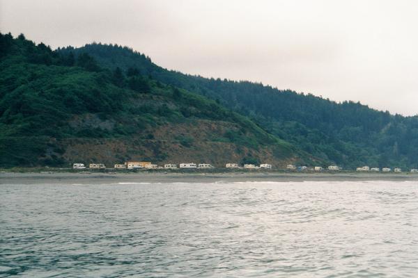 I left a copy of my float plan with Ranger Rickey. At first I considered getting ready to launch because the water was so calm. But where could I go in the remaining two hours of daylight? It took me over an hour to get my gear packed into the boat the first time and rolled out to the edge of the beach. It would still take more time to get into my wetsuit and on the water, then my equipment would be wet for my first full day on the water. I decided to walk into the nearby town of Orick for dinner instead. I felt nervous about my boat sitting in the dunes. I was nervous about doing a 180 kilometer expedition on a rugged and unknown (to me) coastline. I was nervous about leaving my car behind with a poor plan for getting back to it. I was too nervous to eat but forced myself to eat dinner anyway, feeling like the condemned man at his last meal. I felt like I was shaking inside and wondered if people could tell from the outside. I walked back after dinner to sleep next to my boat in the sand. There is this point at the start of a trip where I feel neither fish nor foul: I'm not a camper yet, so I don't want to unpack my gear, but I have to take some of it out even to camp next to my car.