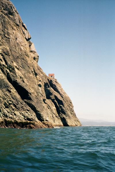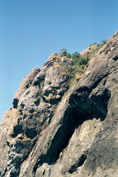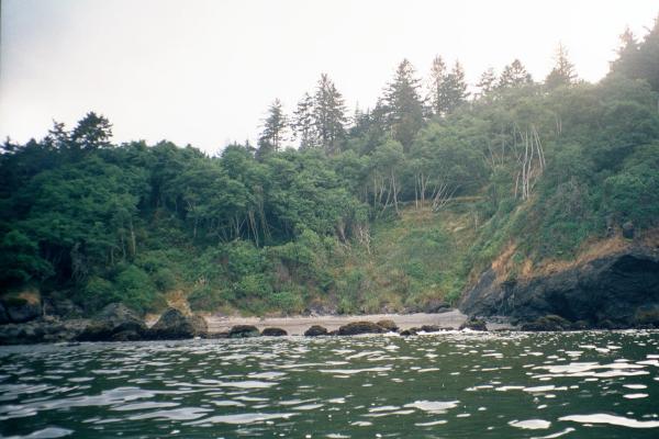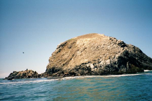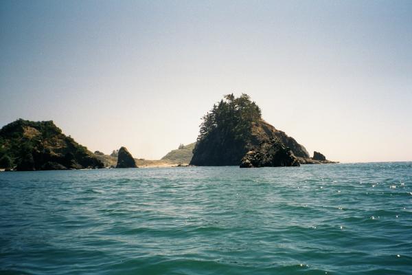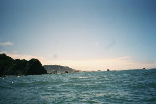 After lunch I paddled past one little point after another until I rounded Elk Head and found beautiful Trinidad State Beach. The first cove, College Cove, is isolated from the main beach and is a place I considered "Guerrilla Camping" in a park that normally doesn't allow overnight camping. But it occurred to me that I put things like this in my float plan and left it with some other rangers. Perhaps they have called their buddies at Trinidad and warned them that I am coming. It was also only 2:00 AM on a bright sunny day so I kept going. The main beach here ends at Trinidad Head, a huge monolithic rock (100 meters tall) connected to the mainland by a spit (and roads and houses). The sides of the head are so steep that I could only see glimpses of the cupola of the lighthouse until far enough past it to look back and up.