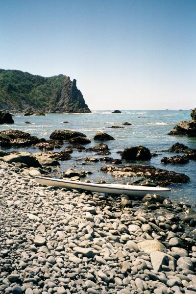 After 16 kilometers of "boring" beach with dolphins and whales I approached Patrick's Point, My Coaster is a boat designed for paddling in rock gardens, but fully loaded with camping gear it feels sluggish and unresponsive. As a result I was a little conservative going behind the rocks of the point. Around this point and the next I start seeing California Sea Lions on the rocks. They barked at me and jumped off the rocks! Usually sea lions are less shy than this. I landed on a private little beach for lunch with mild waves courtesy of the protection of Patrick's Point.