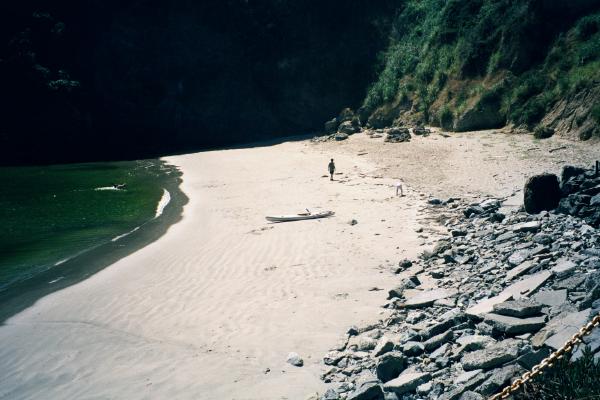 I stopped at the beach on Trinidad Bay and then continued down the rocky coastline south of the bay looking for a beach that was not visible from the houses or the road. I bypassed the nude beach and finally found a small pocket beach protected by a field of rocks I had to work my way through. I asked some locals on the beach if camping would be allowed and it turned out they had camped there before and figured that it would probably be OK.