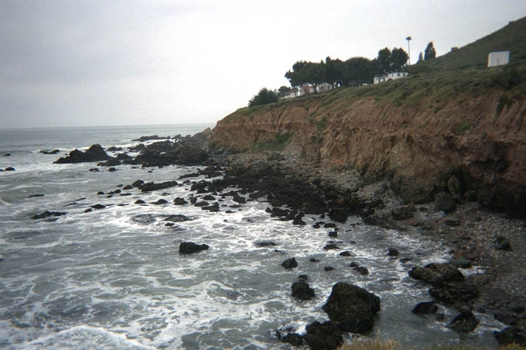We paddled along the shore and past the beach at the base of the breakwater. We had planned a picnic lunch at the beach but since it was so early we went on to explore the breakwater first. The swells were not as high as the evening before and they only occasionally managed to splash water over the rocks of the breakwater. I sat in a place where the rocks were damp and tried to entice the waves to get me wet. I asked Don if he was ready for his morning shower, but he stayed well back with a camera ready to catch me in the thick of it. The waves calmed down. I tried everything to get them to rise up: I drifted closer and closer to the breakwater. I turned by back on the action. I opened the hatch to my kayak for a second. I took out a non-waterproof camera that had some film in it I wanted to use up. The waves broke over a different spot and we moved there. Nothing worked. I had a long drive home in the afternoon and couldn't sit around here all day waiting for trouble, so we gave up. We did paddle out around the end of the breakwater to see what it looked like on the seaward side. There was a natural row of rocks here and the breakwater was built around and behind these. This was apparently a natural harbor and the man-made breakwater is just an improvement on that. Situating it on a natural reef like this also means the man-made structure will last longer and need less maintenance.