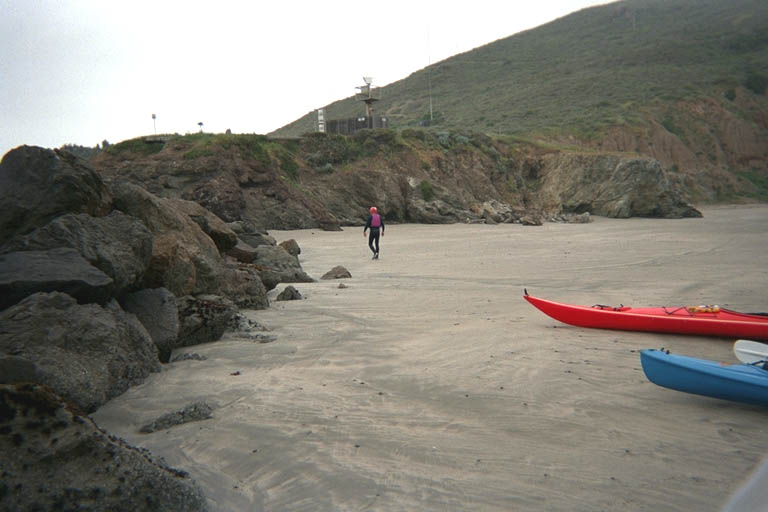 Several other kayakers sounded interested, but nobody else showed up at 9:00 AM on Sunday except Don and I. We chose a put-in spot well inside the harbor that had a boat ramp and a wide sandy beach. As we were getting into our wetsuits and arranging our equipment two guys came by with a zodiac. We were interested in seeing how these guys did in the rougher than we expected surf. They pulled the boat out into waist deep water, then started the engine. I distinctly saw blue smoke come out when it started that first time, but apparently it died on them. For the next half hour we watched them pull and pull on the starter of that engine, but I never saw another puff of blue smoke. We launched with no problems over the surf and Don joked that when we got back they would still be there in the surf pulling on that engine. This did not turn out to be true, but when we came back two hours later their truck was also gone so they must have given up.