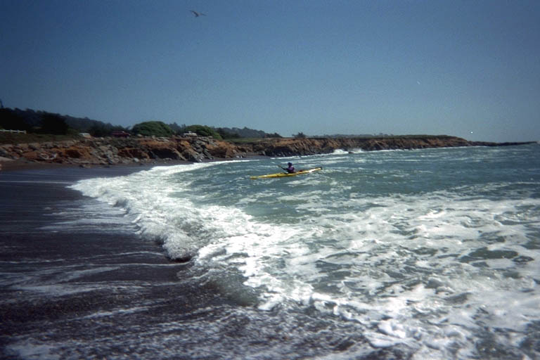 When I had checked the weather that morning, NOAA was reporting 10 foot swells in the neighborhood. Joan had billed this trip as semi- protected coastline and much of the coastline did face south away from the prevailing wave direction. The beaches we started and ended at were protected but the rest of the coastline we passed had pretty large waves breaking into it and we stayed well away. The water was choppy and every once in a while a large swell would lift us up on its way to shore. I figured this was just one of those 10 foot swells and wasn't the least bit surprised. We were traveling southwest with the prevailing wind, current, and waves pushing us along. Despite this everyone else seemed in a bit of a hurry and I was working hard to keep up. We made excellent time. This was not a day I would have chosen to go kayaking by myself because I wouldn't have been able to paddle close to shore. But I was perfectly comfortable in the water. Lee, one of the more experienced paddlers, made the rounds talking to everyone and asked me if I was comfortable. I found out later he was asking this to see whether or not I was close to panic in these large seas. Several of the "surf chickens" were apparently very uncomfortable in this water and needed some coaching, especially for the landing. Penny (the matriarch of the BASK club) chose the landing spot and directed traffic. She landed first, caught some of the boats as they came in, and helped pull them out of the surf. She waved some of us back out so the "surf chickens" would have company at sea until they were safely landed. Everyone did land safely and easily. I felt honored to be ignored by Penny as I made my landing: She must think I can handle myself in the ocean! (I wonder if she is correct...)