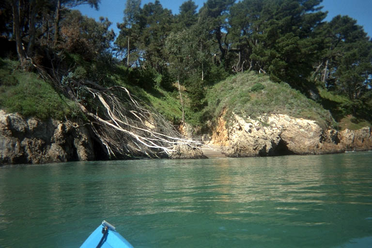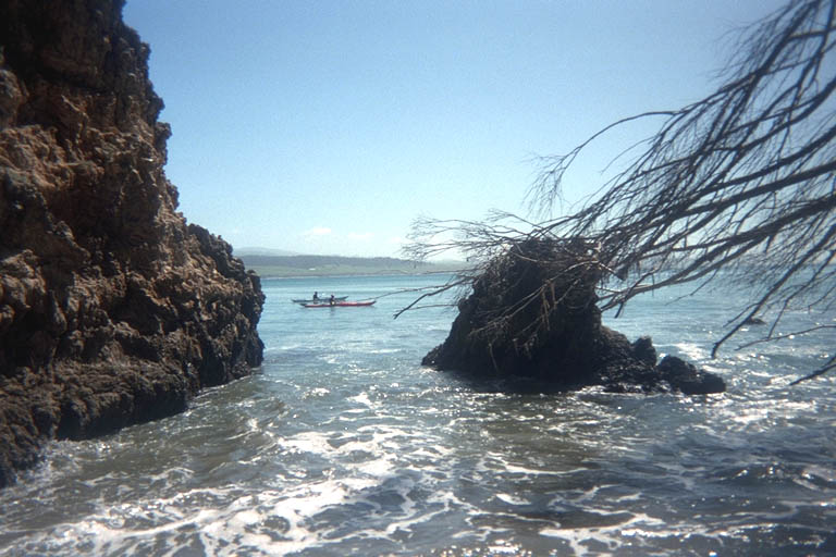 Most of the BASKers were camping at the San Simeon State Beach, so I met them there on Friday morning. The original plan was to paddle down to Cayucos State Beach, but there was a boat ramp just south of the campground that had mild waves. Cherilyn, a kayaker who I have never seen in a boat because she has had her leg in a cast forever, was getting in a kayak for the first time in six months. She liked this mild beach and convinced the rest of us to do a trip that would land here. So we shuttled all the kayaks about 14 kilometers north to Simeon Point. This turned out to be a beautiful little cove well protected behind a hook of land that pointed straight south. A few of us impatiently got in the water and explored the inner edge of this point. The other half of the kayakers (eight total) took more time getting in the water then started straight South. I think they missed the best part of the trip! This little point had calm water behind it and a rocky shore with little caves carved into it. None of the caves were large enough to paddle into, but there was one little beach that had a dead tree hanging down on it. There was just enough room to duck around the branches of the tree and land on the beach. Then I got some wonderful shots, through the bleached white branches of the tree, of kayakers paddling by.