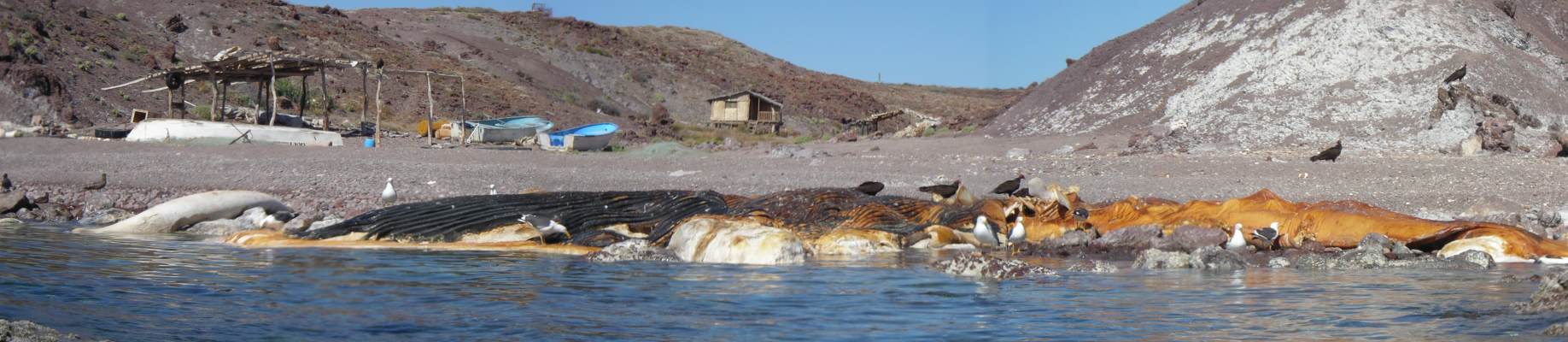 Dead whale in front of panga fishing camp