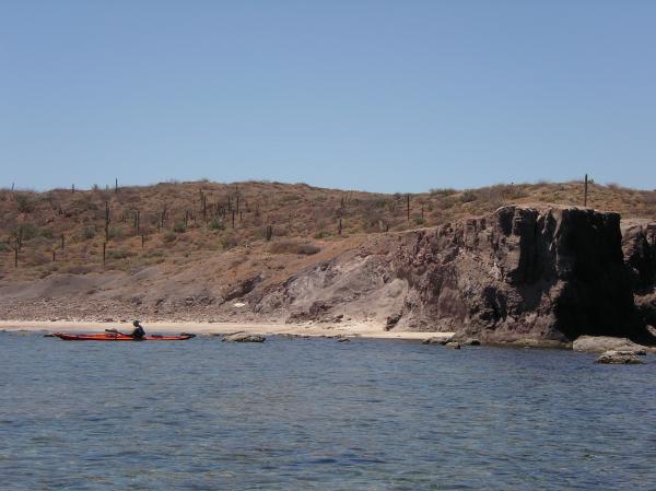 Doug Hamilton rounds a rocky point past a sandy beach