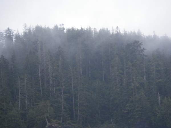 Fog streaming out of the trees near the shore