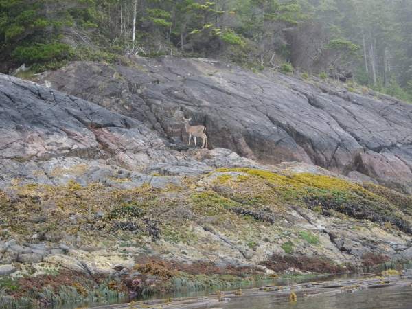 This deer ws afraid of something on the island and ran over the rocks to get away