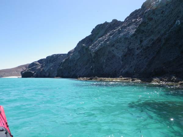 White sand under the water below black cliffs made for electric blue water