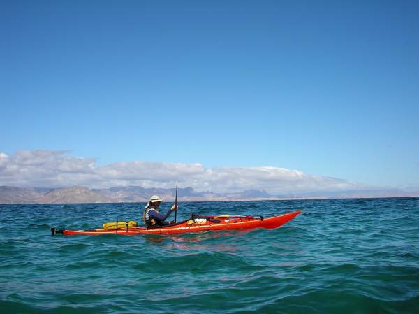 Doug Hamilton paddling up the shore of Isla San Jose