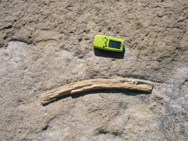 A fossil bone in the sandstone cliff on Isla San Jose