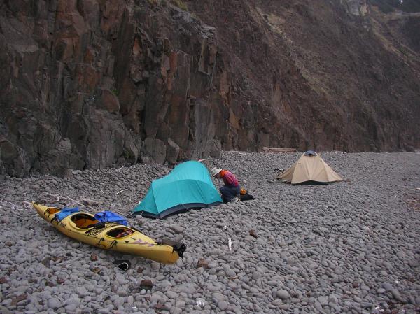 Dick Ryon in camp on our gravel beach on Tillamook Head