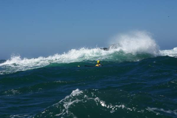 The intrepid kayaker calmly paddles past a boomer off Hubbard Mound