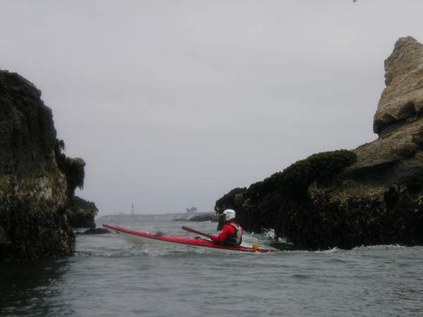 Dave Littlejohn in a washover with the Point Arena Lighthouse beyond