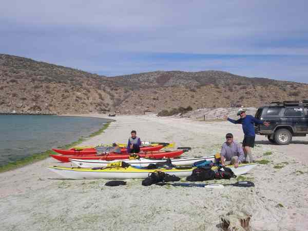 Doug Hamilton, Dave Harry and Don Fleming packing kayaks at San Francisquito Cove