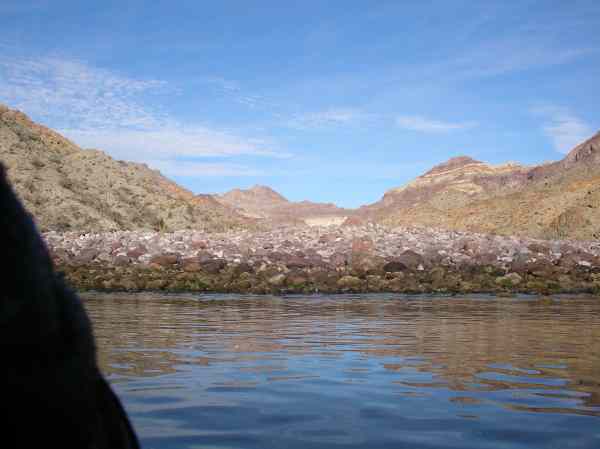 A large arroyo with no palm trees visible