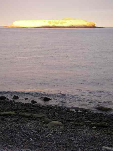 A bird covered rocky island off Isla Partida in evening light