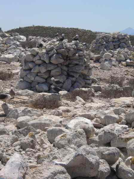 A pair of gulls mating in front of one of the 'mysterious cairns' on Isla Rasa