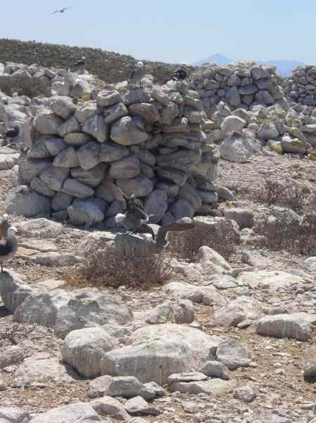 A pair of gulls mating in front of one of the 'mysterious cairns' on Isla Rasa
