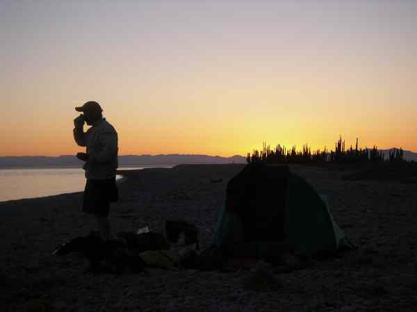John Somers silhouetted against the sunset on Isla san Lorenzo