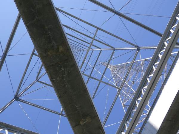Paddling under a power tower on the Napa River