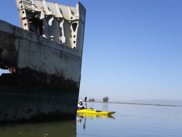 Fran Sticha behind the wreck of a destroyer on the Napa River