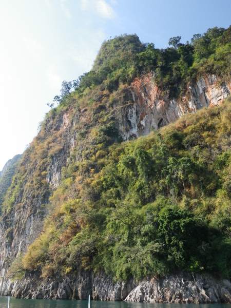 Limestone cliffs drop into the lake in Khao Sok, Thailand