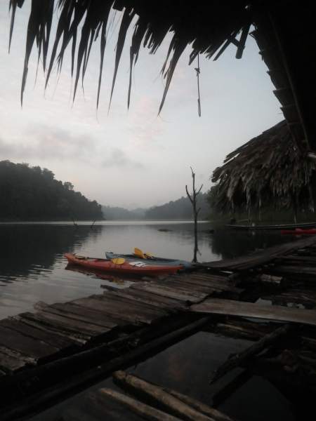 Kayaks and calm water in the morning in Khao Sok, Thailand
