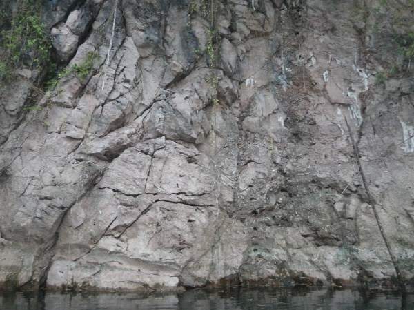 Interesting stone textures dropping into the water in Khao Sok, Thailand
