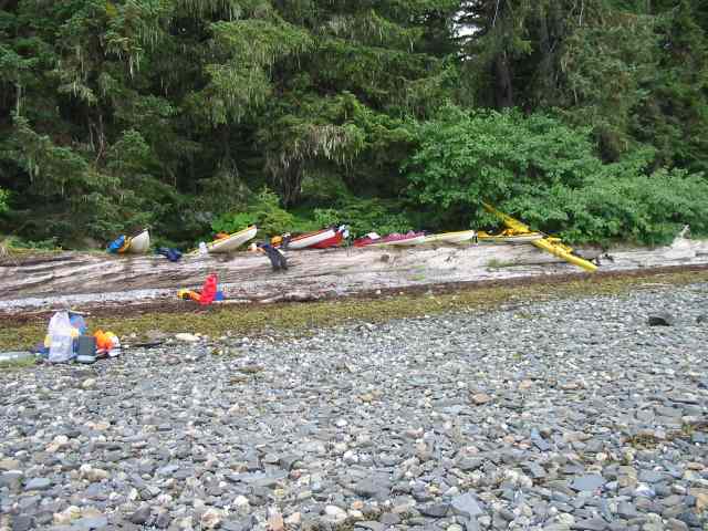 Kayaks parked above the high tide at Ideal Cove