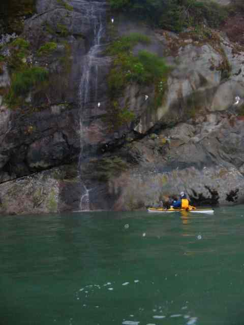 Kate DesLauriers in front of small waterfall in Fredgrick Sound