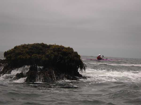 Gordon Schanck coming out behind a sea palm covered rock