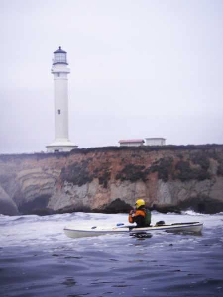 The intrepid kayaker in front of the Point Arena Lighthouse